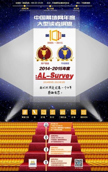 AL-Survey读者调查活动全称:中国幕墙网年度大型读者调查暨“我最喜爱品牌”评选活动。(以下简称AL-Survey)我司济南天辰铝机股份有限公司作为门窗幕墙机械制造领域的资质企业,携“天辰”品牌,强势入围本次调查活动。通过活动参与者的票